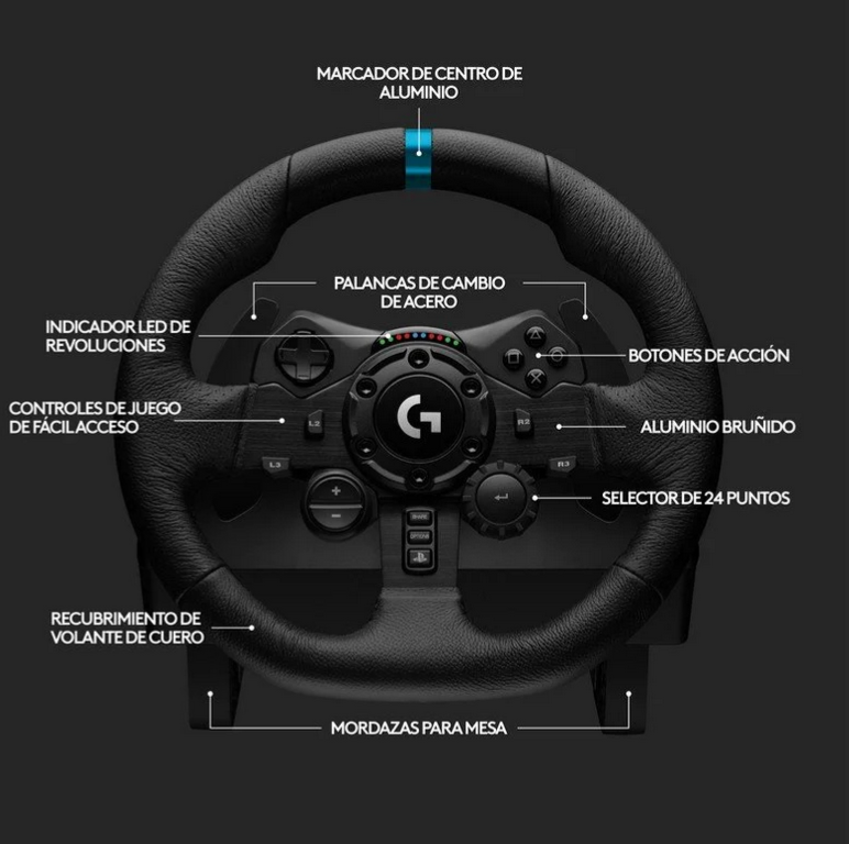 El G923 está pensado para quienes se inician en los juegos de conducción. Su aro, forrado en cuero, proporciona un agarre cómodo y duradero, con un ángulo de giro de hasta 900º. Además, cuenta con un panel de botones amplio y accesible, junto con levas metálicas de alta precisión que permiten cambios de marcha rápidos.